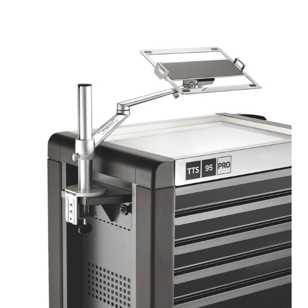 features a wide adjustment range for height, vertical tilt, and rotation, and is made from durable aluminum alloy.